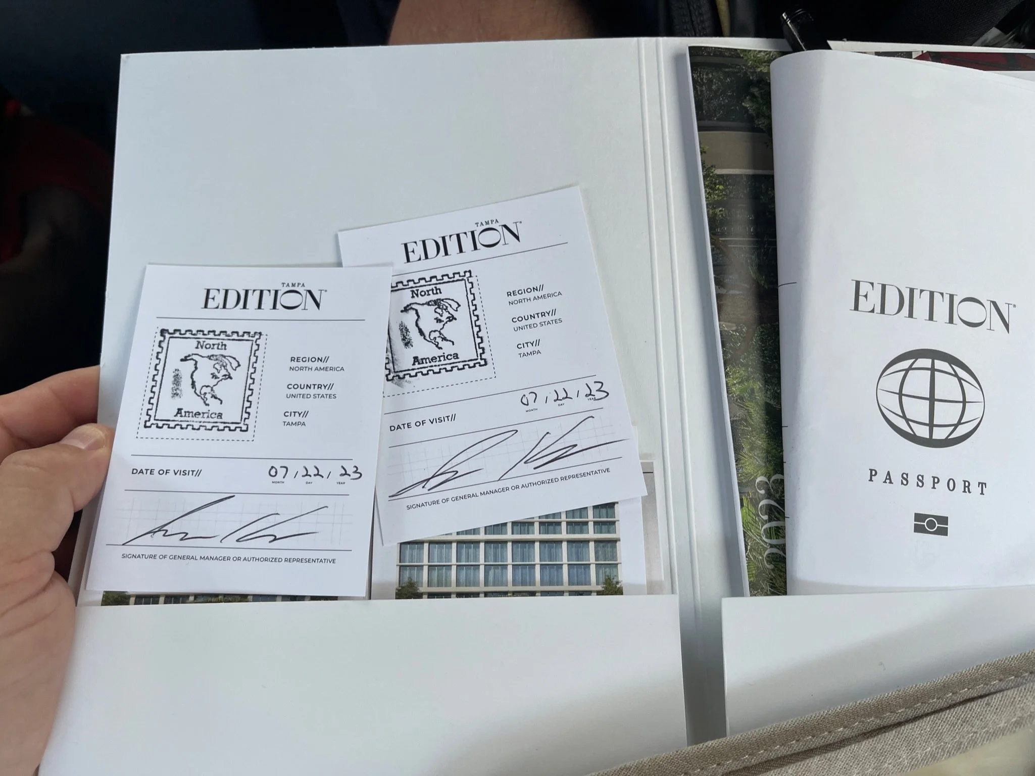 The first official stop on our EDITION passport world tour, the exotic Tampa, FL . To be honest we would have never visited Tampa if it hadn’t been for the Tampa EDITION. In chatting with our uber drivers we learned Tampa has really exploded during the pandemic and is home to a vibrant downtown all centered around the property and the massive Tampa Bay Lightening Hockey Stadium. The EDITION passport idea was born on our flight to the USA from China so we need to find a way to print our new design so we could have the staff at the Tampa Edition sign it. Upon arrival Michael greeted us at the door and waited for us to check in and showed us all the amazing things about our room. We finalized some details and the staff was able to get us in last minute to the Michelin starred restaurant the Lilac Room located in the lobby. We had an amazing dinner with awesome service by our waitress Trinity and then decided we needed to go get this passport printed. We googled print shops and called an uber. 30 min later in the middle of suburbia Tampa we waited while the print staff tried to make our vision a reality. It was late at night so their normal layout staff wasn’t working so we compromised and just had them print out the passport as individual cards while planning to print the full “real” passport when we returned home to China. After 3 hours we returned to the EDITION with something to stamp and pulled up to a line around the block of people dressed to party. We in our sweats and leggings fit right in (ha). We flashed our room key cards and the bouncer let us in and we feeling old and jet lagged went back to our room to relax and enjoy the restful night.